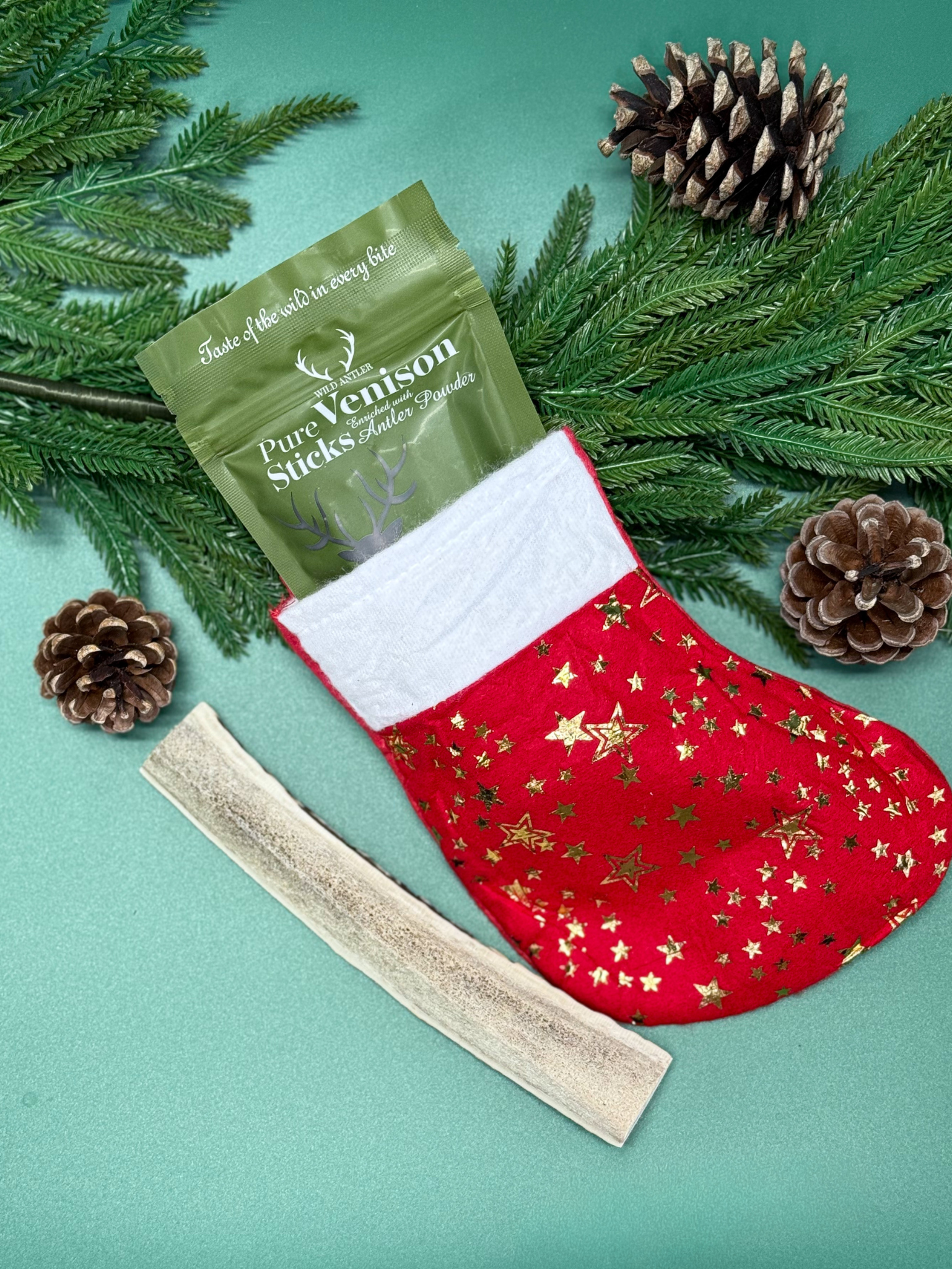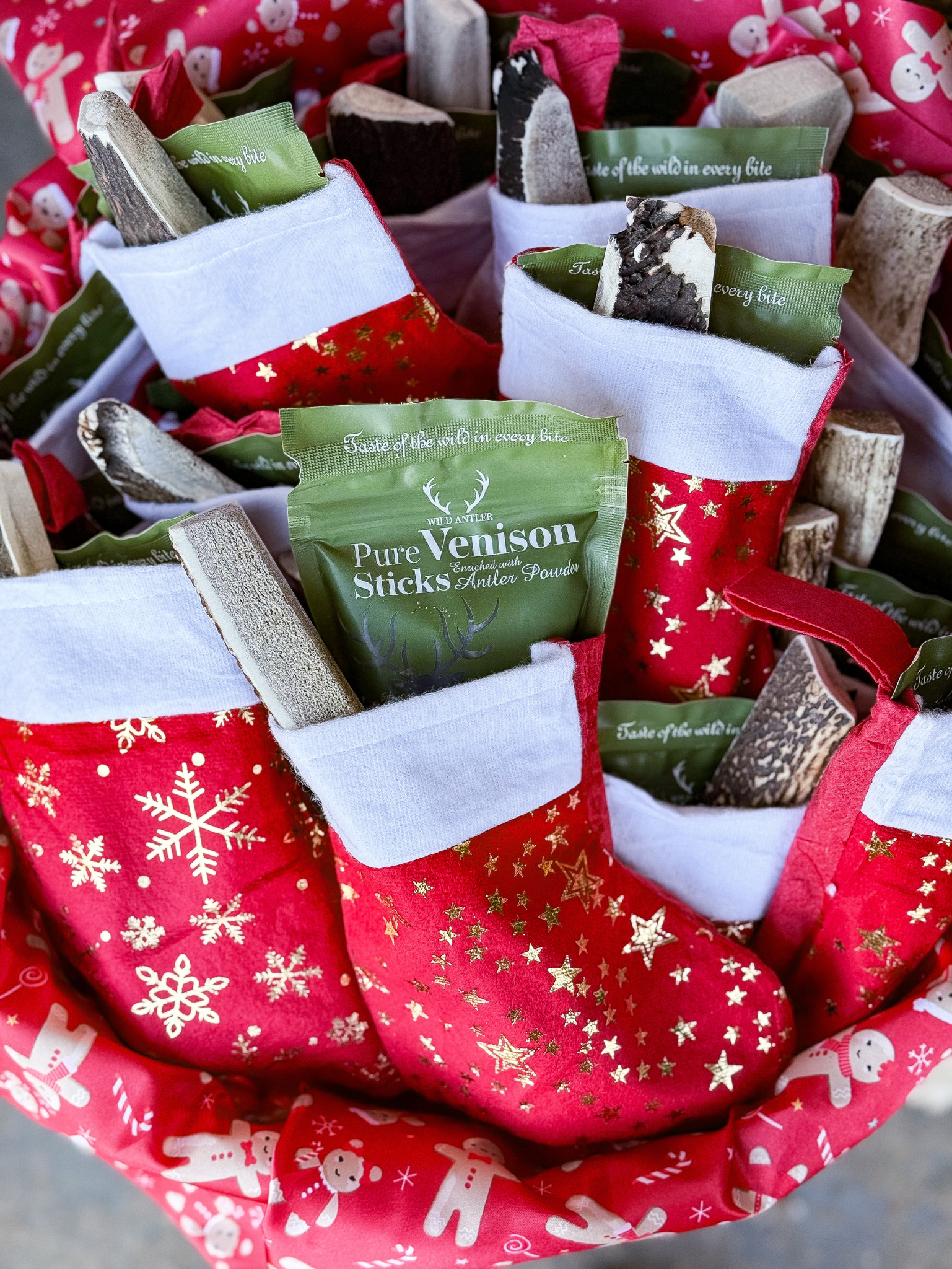 Give your dog a taste of the wild this holiday season! This festive Christmas stocking comes filled with Pure Venison Sticks enriched with natural Antler Powder and paired with a Large Split Red Deer Antler Chew—a long-lasting, nutrient-rich chewing experience dogs love.